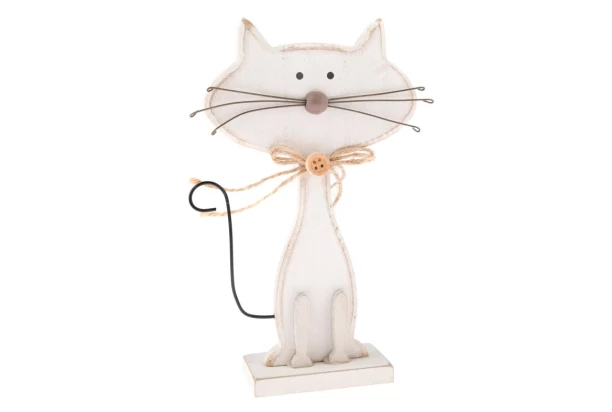 Dřevěná kočka na podstavci v krémové barvě má černý kovový ocas a vousky. Nechybí ani ozdobný jutový provázek s knoflíkem. Dekorační soška potěší všechny milovníky zvířat a majitele koček.