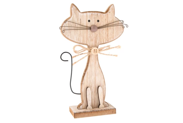 Dřevěná kočka na podstavci v přírodní barvě má černý kovový ocas a vousky. Nechybí ani ozdobný jutový provázek s knoflíkem. Dekorační soška potěší všechny milovníky zvířat a majitele koček.