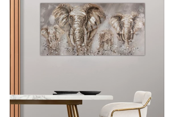 Ručně malovaný obraz na zeď s moderním zvířecím motivem slonů rozzáří interiér a stane se dokonalou dekorací na každé stěně. Ideální do domácnosti, kanceláře nebo jako forma originálního daru. Rozměr 140×70 cm.