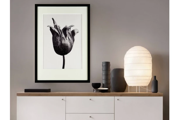 Obraz v dřevěném černém rámu s bílou paspartou má jednoduchý botanický květinový motiv. V černobílém obrazu se nachází krása, která okouzlí všechny milovníky moderního bydlení. Rozměr 35×50 cm.