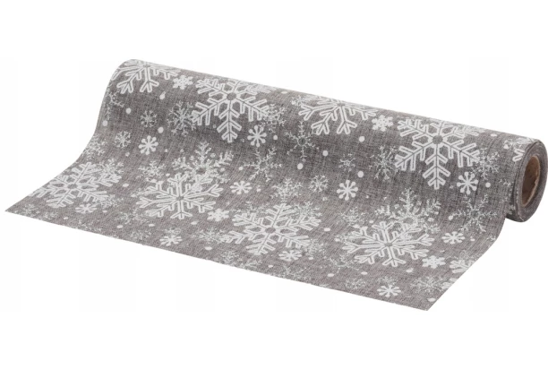 Krásná dekorativní látka v šedé barvě o rozměru 250×28 cm s vánočním vzorem sněhových vloček se hodí jako běhoun na Váš sváteční stůl. Látkou také můžete ozdobit ostatní nábytek a vykouzlit tak slavnostní atmosféru v každé místnosti. Vhodné i pro balení dárků.