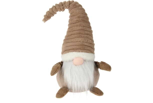 Sympatický okouzlující vánoční skřítek v pískově hnědé barvě s bílými vousy a dlouhou čepicí je neodmyslitelnou součástí vánoční výzdoby každého interiéru. Dekorativní figurka je ušita z měkkého plyšového materiálu, který je příjemný na dotek. Trpaslík udělá radost všem blízkým a bude vypadat krásně u krbu, na parapetu, poličce, stole nebo pod vánočním stromečkem.