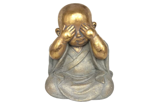 Velká socha v podobě dětského Buddhy s gestem nevidím je ve zlaté barvě a stane se dominantou Vaší domácnosti. Stylová a originální dekorace, která v místnosti navodí příjemnou atmosféru a klidnou náladu. Socha je vysoká 47 cm.