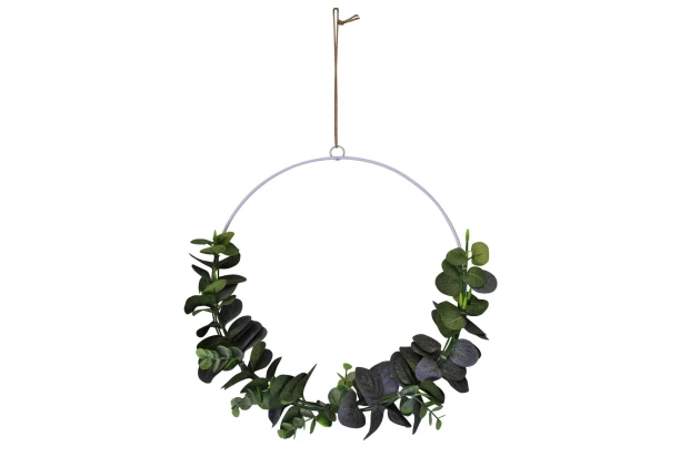 Umělý věnec o průměru 26 cm je krásnou nástěnnou dekorací, která je vyrobena z bílého kovu a obsahuje umělé eukalyptové listy vetkané kolem kruhu. Součástí je jutový provázek pro zavěšení na zeď.
