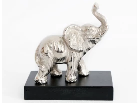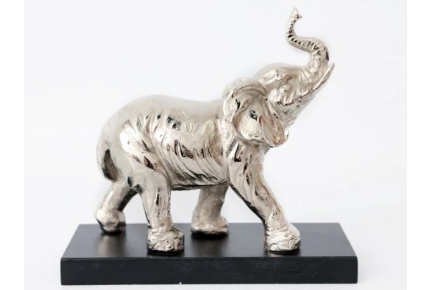 Dekorační kovová soška ve tvaru velkého slona se vztyčeným chobotem stojící na dřevěném podstavci dokonale ozdobí Vaši poličku. Slon v lesklé stříbrné barvě vnese do každé domácnosti štěstí a radost.