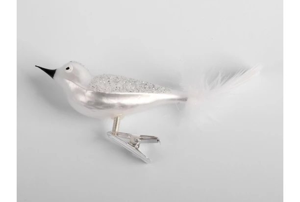 Elegantní skleněná vánoční ozdoba ve tvaru bílého ptáčka krásně dozdobí Váš stromeček. Vánoční ptáček okouzlí svým zpracováním a ocáskem z peří. Díky skřipci lze ozdobu snadno připnout na větvičku a vytvořit tak na stromečku krásnou vánoční dekoraci.