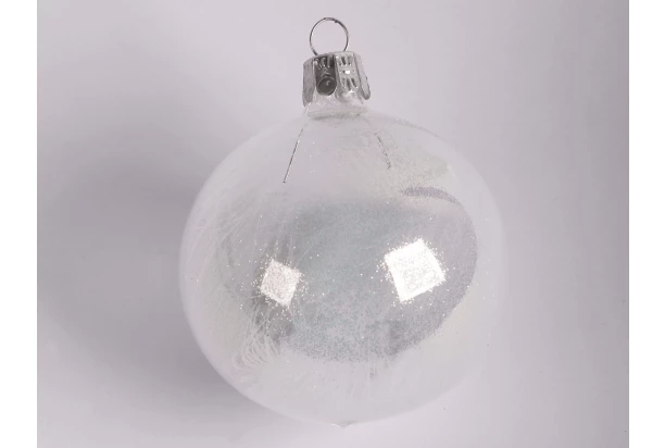 Průhledná vánoční koule, která se třpytí, je vyplněna bílým peřím. Vánoční ozdoba o průměru 7 cm je vyrobena ze skla a do Vašeho domova vnese skutečné kouzlo Vánoc.