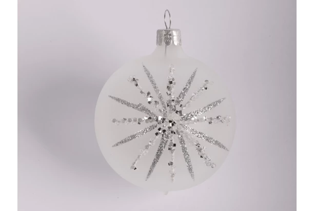 Bílá skleněná vánoční ozdoba ve tvaru koule o průměru 7 cm je okouzlujícím doplňkem každého vánočního stromku. Díky třpytivým korálkům tvořící obrazec sněhové vločky působí vánoční koule velmi elegantně.