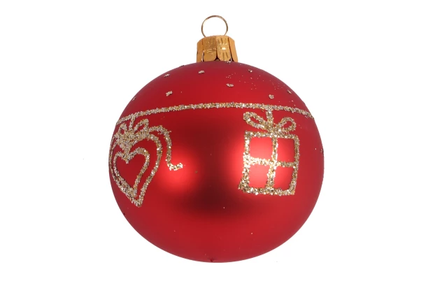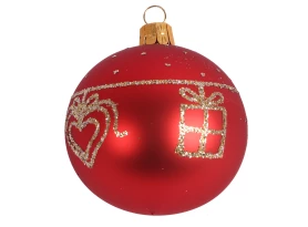 Červená skleněná vánoční ozdoba ve tvaru koule o průměru 6 cm s motivem dárečku a srdíčka je okouzlujícím doplňkem každého vánočního stromku.