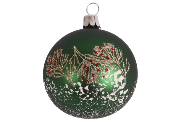 Zelená skleněná vánoční ozdoba ve tvaru koule o průměru 6 cm s motivem větviček a bobulí je okouzlujícím doplňkem každého vánočního stromku.