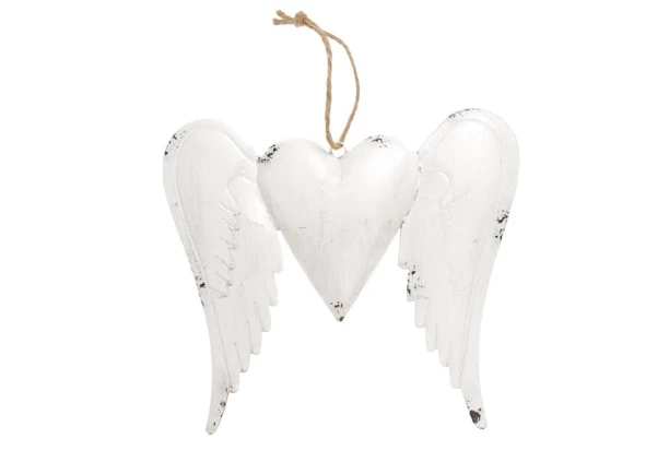 Kovová dekorace ve tvaru srdce s křídly na zavěšení příjemně ozdobí Váš interiér. Barva bílá antik dodává dekoraci přirozený opotřebovaný vzhled, který však působí nadčasově a luxusně.