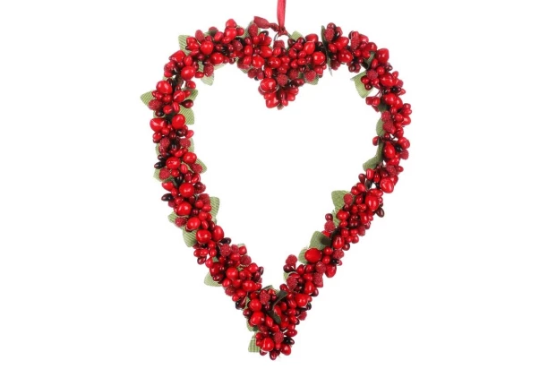 Umělý věnec ve tvaru srdce je ozdoben bobulemi v červené barvě a stane se příjemnou podzimní dekorací, kterou lze zavěsit.