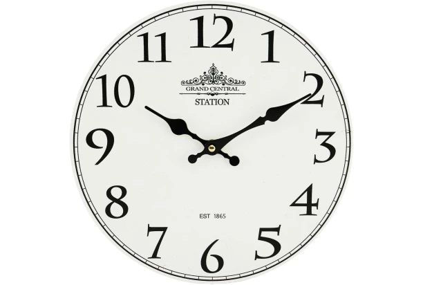 Dřevěné nástěnné hodiny s nápisem Grand Central Station o průměru 30 cm v bílé barvě s černým číselným ciferníkem skvěle doplní prázdnou zeď ve Vašem interiéru.
