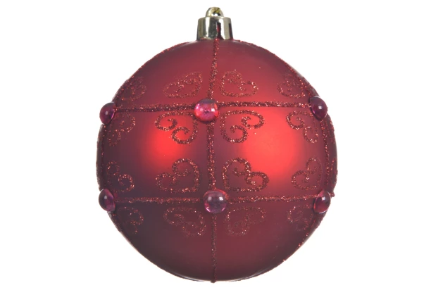 Červená vánoční ozdoba ve tvaru koule o průměru 8 cm je vyrobena z odolného plastu. Třpytky a perličky tvoří jednoduchý elegantní vzor, který připomíná květiny. Tato ozdoba krásně rozzáří vánoční stromeček a oživí vánoční atmosféru.