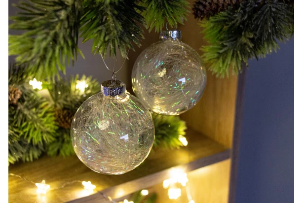 Balení obsahuje 4 vánoční ozdoby ve tvaru koulí o průměru 7 cm, které jsou vyrobeny z čirého skla. Elegantní koule jsou naplněny barevnou dekorací, která se třpytí v barvách duhy. Koule lze snadno kombinovat s ostatními vánočními ozdobami.