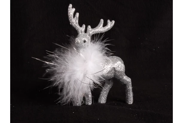 Stříbrný třpytivý sob s peřím se hodí jako vánoční ozdoba na Váš stromeček.