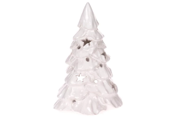Keramický vánoční stromeček v bílé barvě je nejen skvělou dekorací, ale lze jej také využít jako svícen na čajovou svíčku. Plápolající plamínek skrze otvory navodí tu správnou sváteční atmosféru. Výška 20 cm.