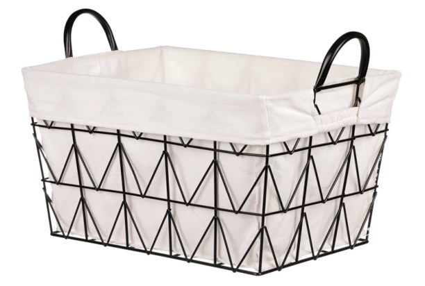 Praktický a stylový kovový košík v černém provedení s úchyty je vybaven bílou látkou. Lze využít na uložení různých věcí a udržet si tak v domácnosti pořádek. Koš o velikosti 40×22 cm najde uplatnění v obýváku, koupelně, šatně, ložnici, kuchyni i v dětském pokoji.