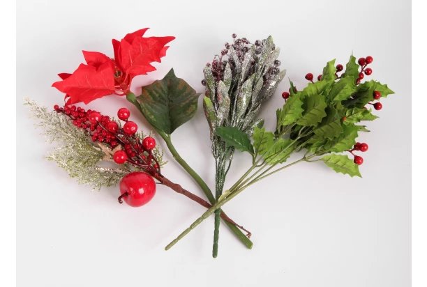 Krásná zimní vánoční dekorace v podobě umělé větvičky s červenými bobulemi a jablíčkem vypadá jako živá rostlina. Větvička, která nikdy neopadá, je skvělá pro vánoční aranžmá a bude vypadat skvěle v truhlíku, ve váze nebo jen tak položená na svátečně prostřeném stole.