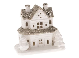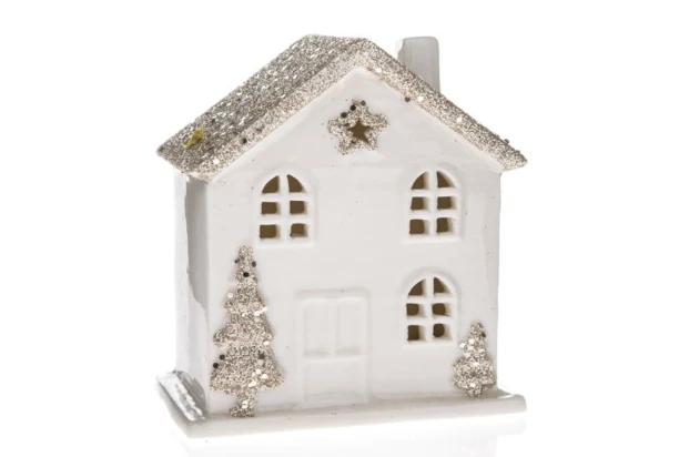 Porcelánový domek s LED světýlky krásně rozzáří okno nebo pokoj. Bílý domeček o výšce 9,5 cm má třpytivou střechu ve stříbrno-zlaté barvě. Stylová vánoční dekorace ozdobí každou domácnost, ve které umocní sváteční atmosféru.
