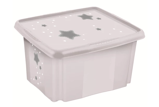 Praktický úložný box s víkem má dětský motiv hvězdiček, a proto se skvěle hodí do dětského pokoje. Do šedého boxu o objemu 45 litrů lze ukládat hračky a jiné drobnosti.