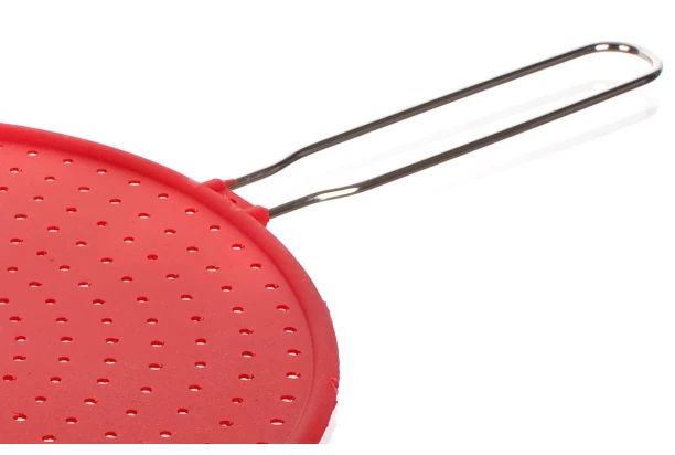 Červené silikonové ochranné síto na pánev s nerezovým držadlem má průměr 28 cm. Síto ochrání před nežádoucím prskáním omastku při smažení a díky perforovanému povrchu skvěle odvádí páry.