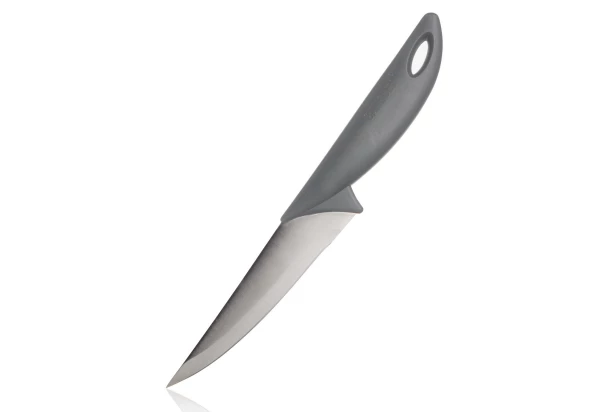 Praktický nůž s délkou ostří 14 cm má plastovou rukojeť v šedé barvě a je nepostradatelným pomocníkem v každé kuchyni.