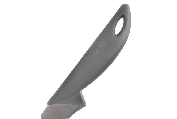 Kuchyňský nůž s délkou zoubkovaného ostří 20 cm má plastovou rukojeť v šedé barvě a je určen pro krájení chleba a dalšího pečiva.
