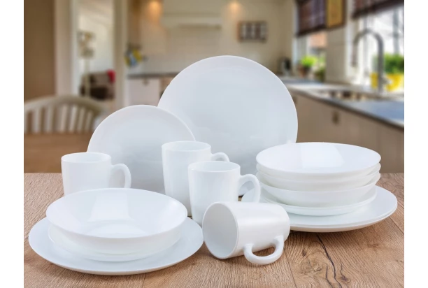 16-dílný jídelní servis v univerzálním bílém provedení se hodí do každé kuchyně. Jídelní sada je vyrobena z opálového skla, které je velmi odolné. Prostřete stůl a servírujte až pro 4 osoby. Podávat můžete hlavní jídla, polévky dezerty či předkrmy a také nápoje.