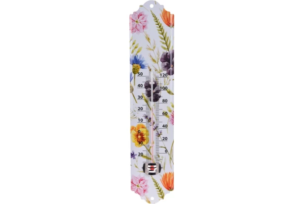 Venkovní kovový teploměr, který lze používat i v interiéru, ve 4 různých květinových variantách. Celková délka 29,5 cm.