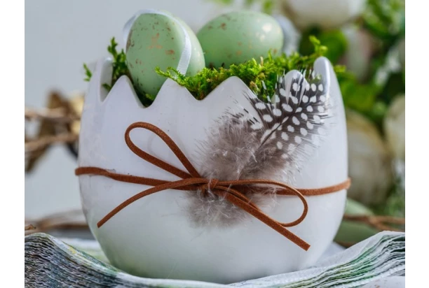 Elegantní bílý keramický obal na osení ve tvaru skořápky je ozdoben jemným peříčkem a hnědým provázkem. Vajíčko položené v osení díky tomuto obalu krásně vynikne a perfektně doplní velikonoční výzdobu. Výška 11 cm.