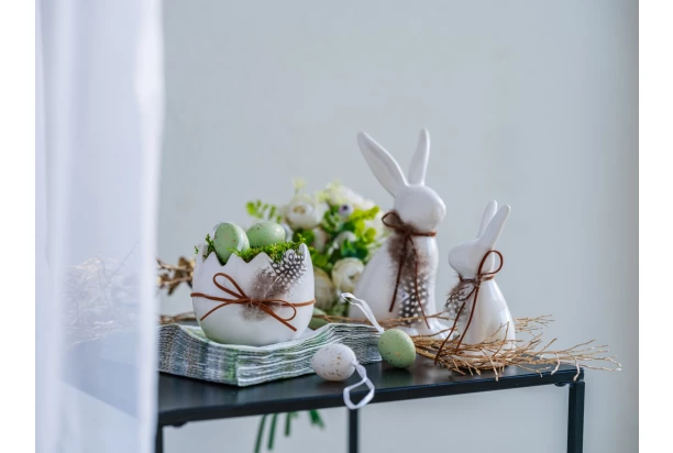 Bílý keramický zajíc s jemným peříčkem a hnědým provázkem je nádherná velikonoční dekorace, která oživí každý interiér. Zajíčka lze postavit na poličku, komodu, parapet nebo kamkoliv jinam a vytvořit si tak jarní sváteční atmosféru. Výška 13 cm.