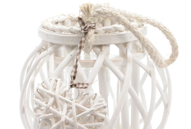 Dekorativní lucerna z bíle lakovaného vrbového proutí je vybavena pohodlnou rukojetí, skleněným svícnem a proutěným srdcem. Svíčka hořící uvnitř vrhá magické uklidňující světlo. Díky této lucerně vnesete do svého domova také útulnost a příjemné teplo. Rozměr 23×22 cm.
