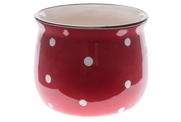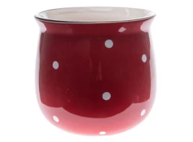 Moderní keramický obal na květináč v červeném provedení s bílými puntíky zvýrazní krásu rostlin a květin. Výška 9,5 cm.