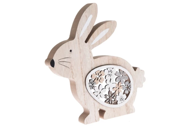 Dřevěná dekorace ve tvaru zajíčka s vyříznutým velikonočním vajíčkem, které má uvnitř květiny, doladí každou výzdobu.