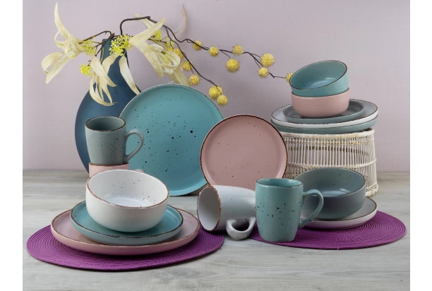 16-dílný elegantní jídelní servis s vysokým okrajem je vyroben z kvalitní kameniny a má moderní vintage vzhled. Saténově matná glazura s ručně malovanými nepravidelnými skvrnami dodává nádobí ušlechtilý nádech ve 4 pastelových barvách – modrá, krémová, růžová a šedá. Prostřete stůl a servírujte pro 4 osoby.