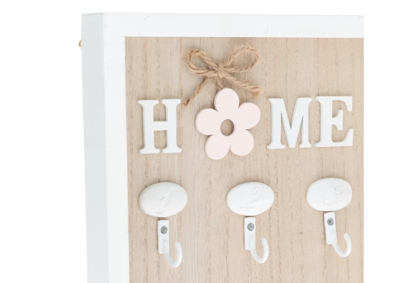 Krásný dřevěný věšák na klíče skvěle doplní předsíň nebo chodbu. Elegantní a romantický design s motivem Home je dozdoben provázkem a květinou. Věšák má 6 háčků, díky kterým budou Vaše klíče perfektně srovnané. Rozměr 20×30×3 cm.
