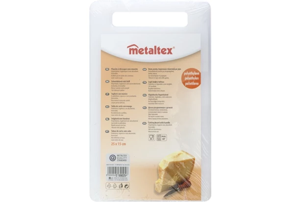 Kuchyňské prkénko na krájení o rozměru 15×25 cm je vyrobeno z odolného plastu v bílé barvě.