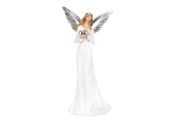 Dekorační soška anděla z polyresinu v bílých šatech a stříbrnými křídly držící srdíčko je symbolem duchovnosti a naděje, jenž přinese do Vašeho domova dotek přepychu a nadčasového kouzla. Tato dekorativní figurka vytváří atmosféru klidu a míru, a proto se hodí pro vánoční období. Postavička anděla o výšce 32 cm zkrátka oživí interiér a dodá mu vyšší úroveň elegance.