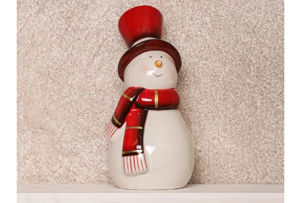 Vánoční dekorace představuje klasického sněhuláka vyrobeného z keramiky. Jeho bílá barva vytváří klidný a tradiční vzhled, zatímco červená šála a klobouk dodávají sošce živý a vánoční nádech. S výškou 14 cm je ideální pro umístění na stůl, polici nebo jakoukoliv část vánočně vyzdobeného prostoru.
