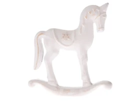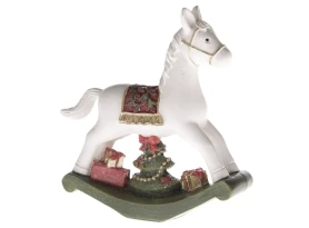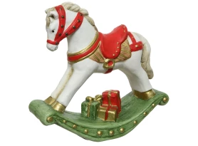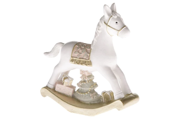Vánoční dekorační soška houpací kůň s drobnými dárky navodí sváteční atmosféru v každém interiéru. Ať už jako dekorace na stůl, na okenní parapet nebo jako doplněk k Vaší sbírce vánočních dekorací, tato dekorativní figurka je opravdovým poutačem pro oči. Nostalgická vánoční dekorace je navržena v klasickém retro stylu, ale barevná kombinace pastelových barev bílá, růžová a zlatá dodává houpacímu koni nadčasovou eleganci.