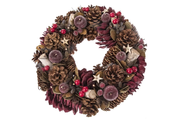 - autentický umělý vánoční věnec zdobený šiškami, bobulemi a jablky