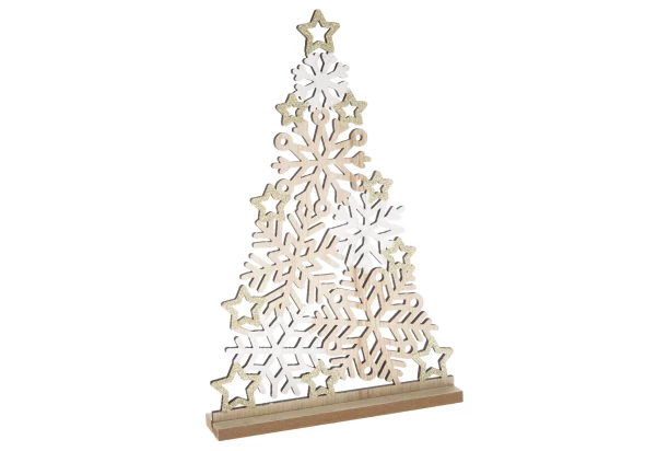 Vánoční dekorace ve tvaru dřevěného stromečku ze sněhových vloček v bílé, zlaté a přírodní barvě je krásným a tradičním doplňkem vánoční výzdoby. Tato dekorační soška o výšce 24 cm přinese do domova kouzlo Vánoc a útulnost.
