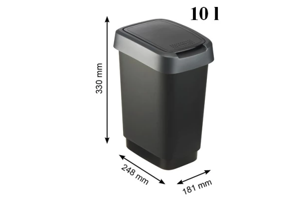 Odpadkový koš o objemu 10 litrů zaujme jednoduchým, ale elegantním designem a skvělou funkčností. Koš je vyroben z odolného plastu v antracitové barvě. Víko má 2 možnosti otevírání – otočné nebo zcela odklápěcí, které lze tiše zavřít. Odpadkový koš vyžaduje málo místa, a proto je praktickým pomocníkem i v malých kuchyních.