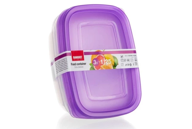 3-dílná sada plastových dóz o objemu 1,25 l s fialovým víkem. Dózy jsou vhodné pro skladování různých potravin.