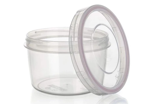 Hermetická plastová kulatá dóza o objemu 0,5 l s růžovým silikonovým těsněním. Potraviny zůstávají dlouho čerstvé a bez zápachu.
