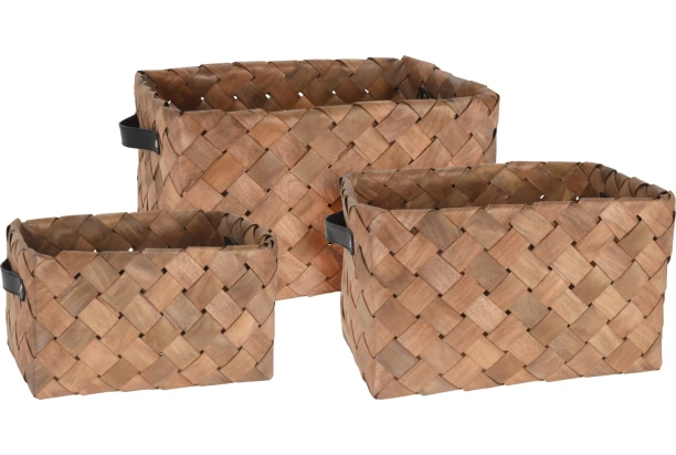 Tato sada obsahuje tři košíky v různých velikostech vyrobených z proplétaných dřevěných proužků v krásné ořechové barvě. Košíky jsou opatřeny černými úchyty pro snadné přenášení. Tyto proutěné koše jsou vhodné pro skladování různých předmětů a zároveň slouží jako dekorativní doplněk do domácnosti.