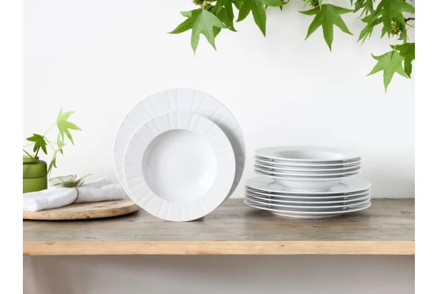 12-dílný jídelní servis v univerzálním bílém provedení se hodí do každé kuchyně. Prostřete stůl a servírujte až pro 6 osob. Podávat můžete hlavní jídla a polévky.