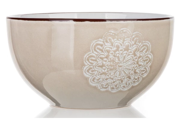 Miska o průměru 14,3 cm s krajkovými ornamenty, připomínající květiny nebo mandalu, je elegantním a zároveň praktickým kouskem nádobí. Její neutrální béžovo-šedá barva a univerzální design umožňují snadné kombinování s jinými prvky stolování. Tato miska bude skvělým doplňkem každé kuchyně a jídelny.