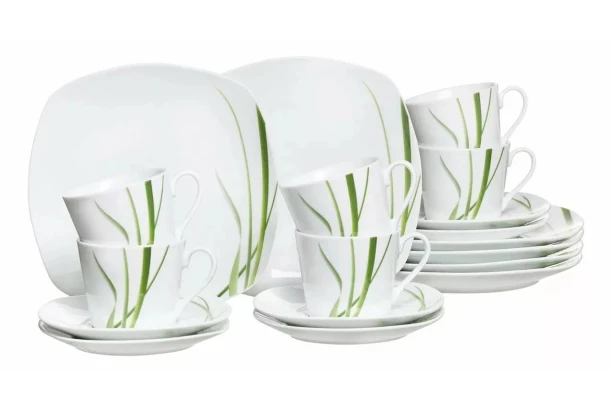 18-dílný kávový servis s jednouchým přírodním motivem je ideální pro každodenní stolování i speciální příležitosti. Nádobí je vyrobeno z vysoce kvalitního porcelánu a dokonale zapadne do každé kuchyně. Prostřete stůl a servírujte až pro 6 osob.